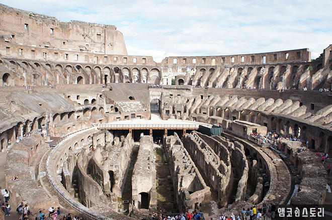 저 아래 1층에서 검투사들이 목숨을 건 사투를 벌이고, 이를 즐기는 로마 시민들이 흥분해서 환호하던 바로 그 장소에 우리가 서 있는 것이다. <글래디에이터> 영화 속에서 러셀 크로를 향해 “막시무스! 막시무스!” 환호하는 소리가 들리는 듯도 하다.