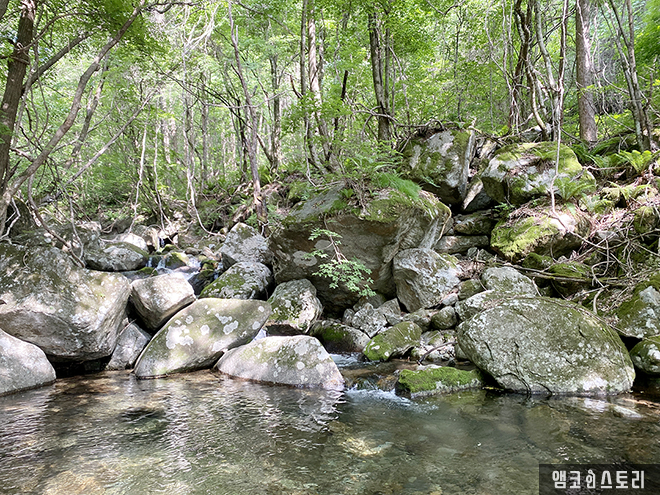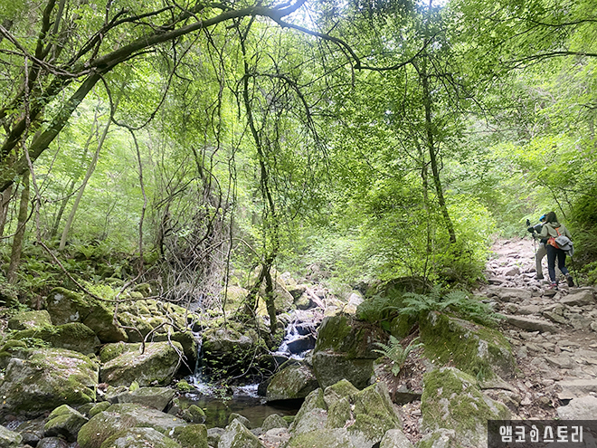 소백산은 정상까지 왕복 최소 10km 정도는 생각해야 하기 때문에 여유 있게 산행시간을 잡는 게 좋고, 필자 개인적으로는 어의곡 > 어의곡삼거리 > 비로봉으로 올라가는 곳이 경사가 심하지 않아 선호하는 편입니다. 능선 위로 올라가기 전까지는 나무 그늘 아래서 올라가기 때문에 선선하고 여름철에도 산행하기 부담이 적을 것 같아요. 이제 곧 여름이 다가오기 때문에 푸릇푸릇한 나뭇잎이 청량하고 시원해 보여서 더 상쾌한 산행이었던 것 같습니다.