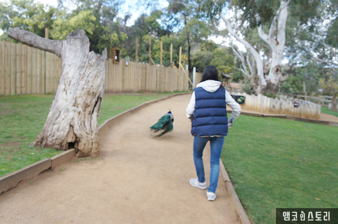 동물원에 입장했는데, 투어 시작 시간이 조금 남았다. 주변을 둘러보는데 어디선가 갑자기 나타난 공작새가 휙 지나간다. 예쁜 날개를 활짝 폈으면 좋겠는데, 총총히 걸어가기만 한다.