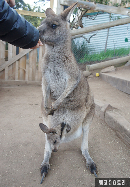 얌전하게 아내 옆으로 다가온 캥거루. 먹이를 주면서 보는데, 주머니에 아기 캥거루가 있는 것이 아닌가!